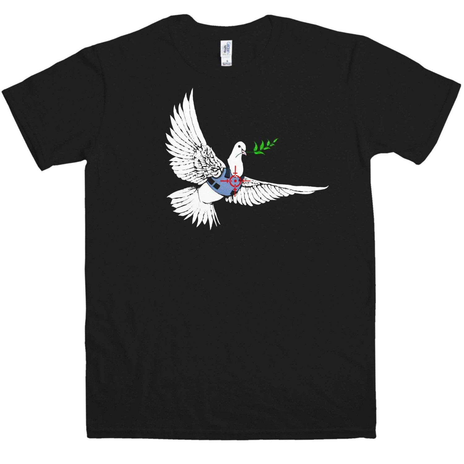 This Banksy t-shirt features the street art legend’s piece which shows a dove of peace which is wearing a bulletproof vest and has a red target symbol over the top of it. This is typical of Banksy’s ability to take a simple image and change it in a way which makes it become extremely thought-provoking. This is a 100% cotton Banksy t shirt.
