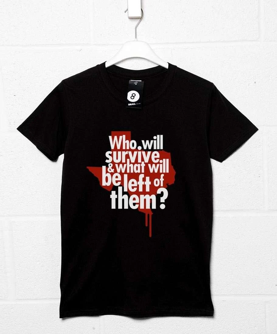 This T-Shirt is inspired by The Texas Chainsaw Massacre and features the tagline of the movie “Who will survive & what will be left of them?” over an image of Texas dripping with blood. Please note this is not an officially licensed product.